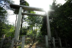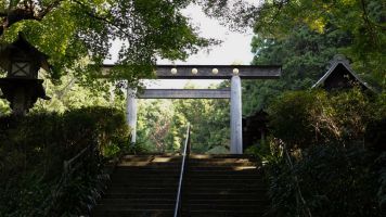 そして日向大神宮を訪れたならぜひとも赴きたいのが、伊勢神宮遥拝所。入口に戻り手水舎の向かい、神社の建つこの山そのものが神体山であることを示す鳥居を右手に過ぎ、その先へ伸びる石段が遥拝所へ続く山道である。片道10分ほどの道のりではあるが、青々と茂る木々の間を縫い、歩みを進めるごとに、神聖な気持ちにさせられる。ゆるやかなカーブを曲がり、鉄塔を過ぎると目的の場所だ。粛として佇む鳥居の向こう、遥か彼方に伊勢神宮がある。現代では、それほどの苦もないが、その昔には庶民にとって一生に一度と言われるほど、憧れであった伊勢参り。この地で遥かなる伊勢を拝し、そんな先人たちの想いに触れてみてはいかがだろうか。