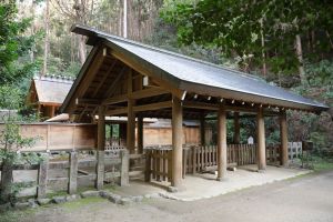 内宮と勾玉池の間にある、朝日泉にも触れておきたい。その昔、この湧き水を万民に与えると疫病がおさまったという、霊験あらたかな泉である。元旦には、祠の扉を開け、霊泉を汲み出し祈願するという若水祭が行われ、三が日の間、この若水が一般参拝者に授与される。神社入口にある手水は源泉を同じくし、飲水も可能なので、手口を清める際にもその神効が感じられるかもしれない。