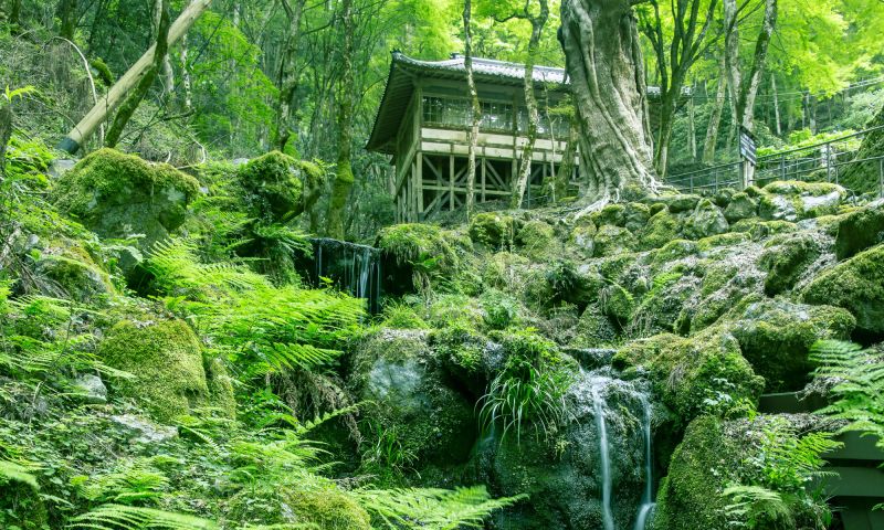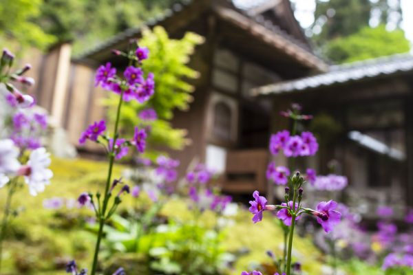 深い緑に覆われた静かな森。大原の有名観光スポットから北へ3kmほど、人跡まれな山中に古知谷阿弥陀寺はある。周囲には300本近いカエデが群生、隠れた紅葉の名所として知られているが、新緑輝く季節もまた趣深い。春から初夏にかけては、境内に咲く白や紅紫の九輪草が見頃を迎える。京都府の準絶滅危惧種だが、この寺では20年以上かけて少しずつ増やし、現在400株ほどを見ることができる。