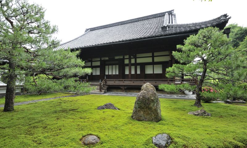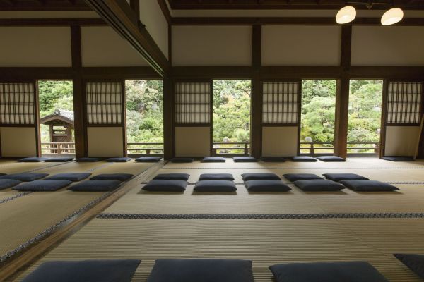 京都五山の第三位、京都最古の禅寺として知られる建仁寺。その塔頭の一つに、両足院がある。本寺と同じく坐禅体験のできる寺としても知られるが、通常非公開のため、境内は静寂に包まれている。坐禅指導の伊藤副住職によると、坐禅は「する」ものではなく「なる」ものだという。大切なのは、今ここにある命を意識し、自身の体や呼吸を実感すること。心を無にすることにとらわれず、その心の束縛から自らを解放させるのである。